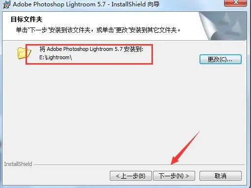 7、选择安装位置,默认路径为“C:Program FilesAdobeAdobe Photoshop Lightroom 5.7”,可点击“更改”为Lightroom选择一个合适的位置,点击下一步继续;
