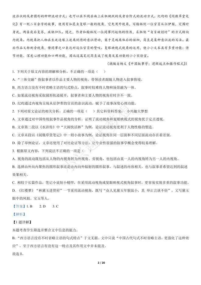 2022年普通高等学校招生全国统一考试语文(全国乙卷) (答案解析)