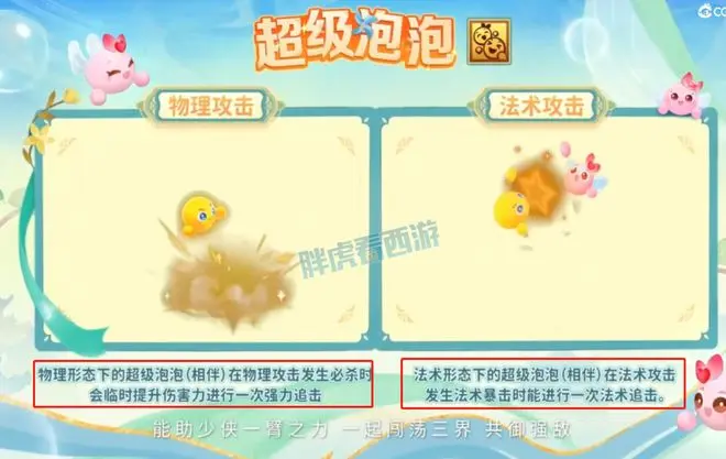 与之相对,超级泡泡也能变身为了超级泡泡相伴,而且会有专属技能,物理是必杀时能再次攻击一次,法术是法爆是能再施法一次。
