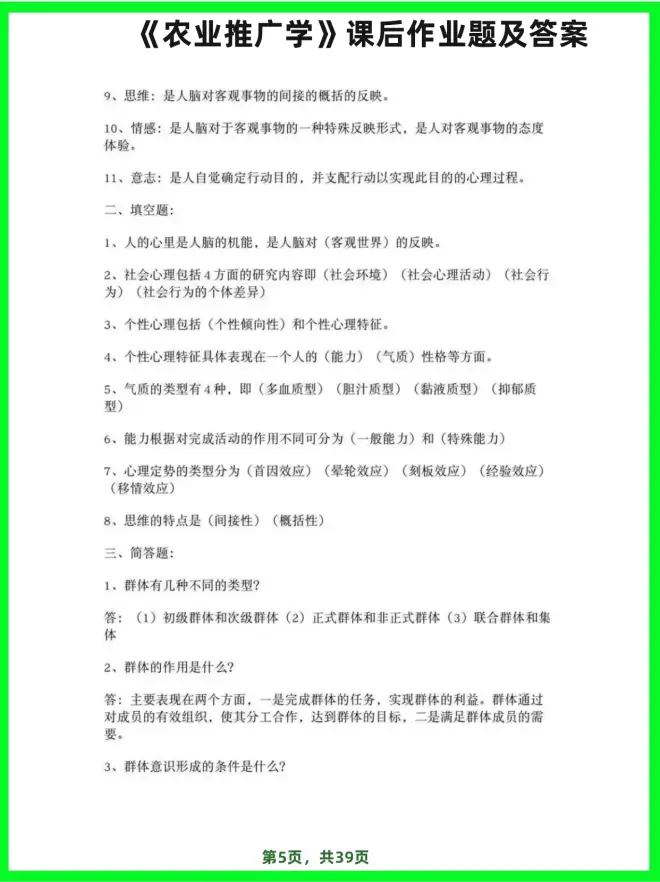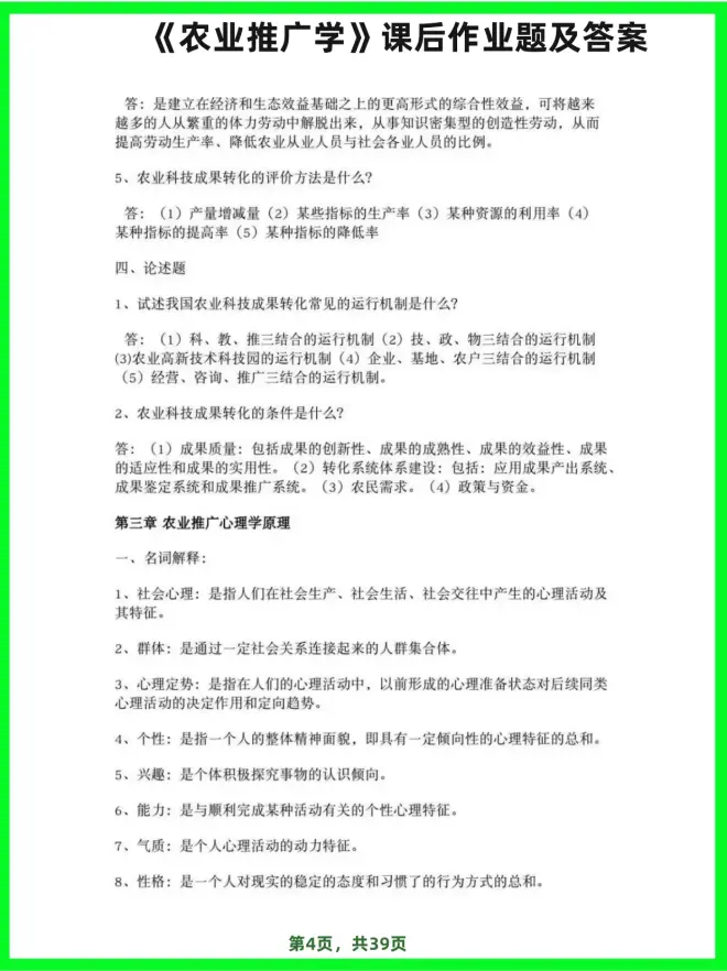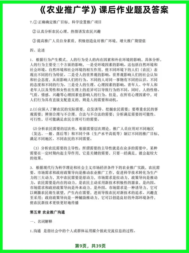 《农业推广学》课后作业题答案,共39页,上传了9页,根据最新教材整理,结合了老师课件及往年常考题型,同步掌握所有章节重点知识和考点知识。可直接打印学习,欢迎有需要的学霸们来拿。