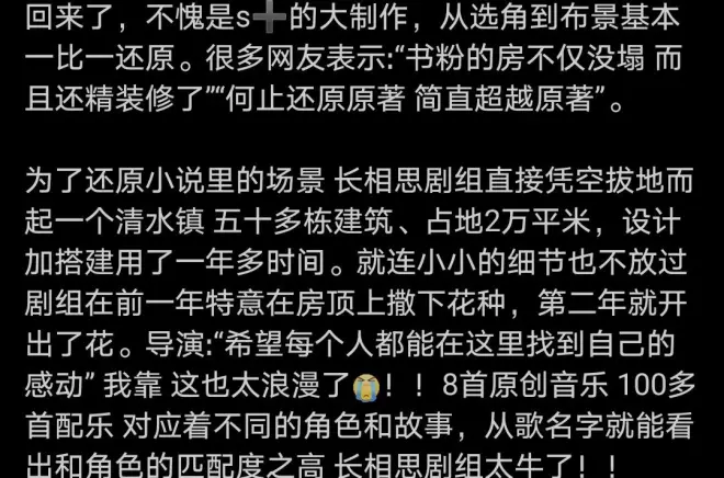 为了还原原小说中的场景,长相思剧组用真实的场景描绘大荒的宏伟广阔,甚至凭空拔地而起一个清水镇,设计加上搭建耗费了一年的时间。