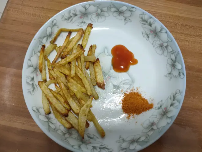 第一:土豆切条、洗净、吸干表面水分(若是没有吸干,靠出的水会使得土豆条没有焦脆感,湿哒哒的,问就是失败过)、加油拌匀(我还加入了盐和南德调味料);