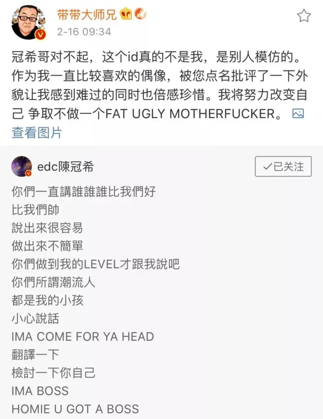 陈冠希继续更新,狗粉丝继续@带带大师兄,然后陈冠希继续怼!