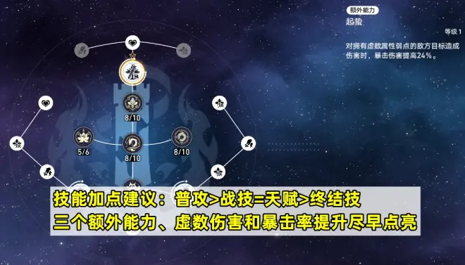 行迹方面,三个额外能力以及后续的虚数伤害和暴击率提升均推荐尽早点亮。