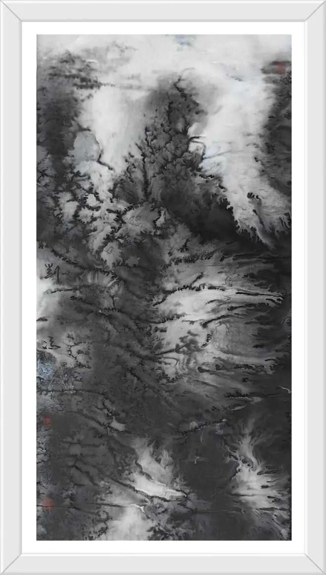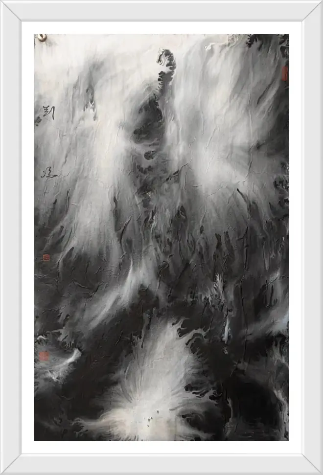 心与丘壑相同境。我对刘冯先生本人的第一印象,就是谦和且风雅,但随着对其丹青作品的深入观赏,即更会发现在其谦和风雅的外表下,是存有着一颗含蓄且朴卓的心。或许也正是因此心境,他才能使更多的笔墨表现转变成一种富有感性思考的深远气象!且对于观赏者群体来说,这种创作取向也早就已是有脱离了单一的笔墨技巧层面,取而代之的,则应是一种更加深刻且鲜明的美学文化体现!而在此造诣启迪下,当代山水画艺术也必然会随之形成一种全新的创作脉络,用刘冯先生本人的话来讲,就是“元宇宙”水墨山水画作,即通过黑白笔墨的浓淡交织和相互映照,来使二维画面呈现出多重层次的意境,概念意义,可谓非凡!