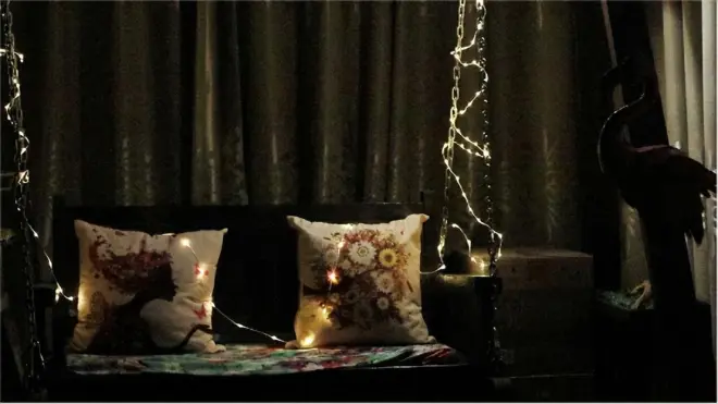 我家里的阳光房在初设计时就有了蛮多想法,甚至还加了防腐木秋千,想着夜深人静的时候在那里看看书追追剧,可是一直没有好的灯饰装点,总觉得差点意思。这次把纳拓星河露营灯缠绕到秋千的链条上,效果立刻就出来了,亮度完全够用,照明氛围两不误,很浪漫啊。忍不住给你们多晒几张,因为这个灯效实在是太好了。