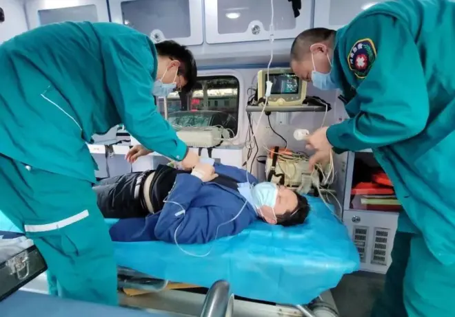 院前一男性患者在活动中突然出现胸痛胸闷30分钟,家属立即拨打120求救,接到120中心指令后迅速出车,电话联系患者家属,指导自救。