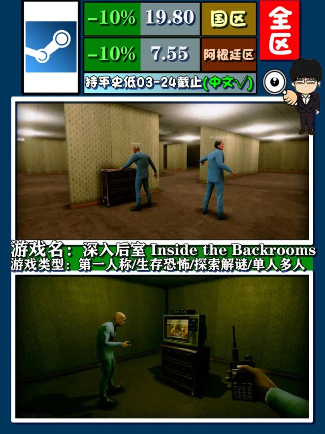 《深入后室》,单机有点恐怖,联机很是快乐,或许是游戏本身建模上不是很高级,所以有点出戏,不过单从轻恐怖和解谜考虑,还是比较适合大家联机游玩的,只怕有玩家会开口就说没朋友,单机方面一个人玩容易迷路,另外恐怖元素主要还是偏向一惊一乍,吓习惯了就基本免疫了