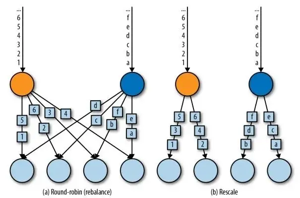 Rebalance和rescale的根本区别在于任务之间连接的机制不同。rebalance()将针对所有发送者任务和所有接收者任务之间建立通信通道,而 rescale() 格式针对每个一个任务的一部分任务之间建立通信通道。