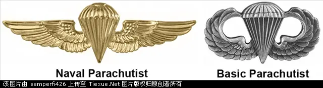 Navy Parachutists Insignia - 海军伞降级别章(在海豹特种部队、EOD等特种作战部队中比较常见),其中右边金色的那个授予经历过10次合格跳伞的人员。