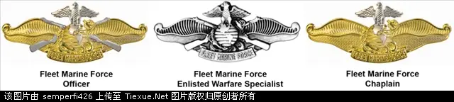 Navy Fleet Marine Force Insignia - 海军陆战队服役章,授予随陆战队服役的海军人员(美国海军陆战队没有医疗兵、即卫生员,军医还有神职人员,这些人员由海军担任),唯一有不同的是在授予神职人员佩戴的军官徽章(左边第一个)时,没有交叉的步枪图案(纯粹自欺欺人的~)