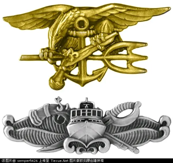 Navy Special Warfare Insignia - 海军特种作战资历章,这应该是军迷比较熟悉的了,上面的那个就是大名鼎鼎的海豹特种部队,下面是特种舟艇部队(SWCC)。授予通过海豹授予通过海豹和SWCC训练、正在或者曾经在两支部队服役过、正在或者曾经在美军特种作战指挥部“USSOCOM”任职过的军官和士兵(JAG里面的A.J.Chegwidden将军虽然在JAG任职但仍然因为在海豹服过役而佩戴海豹的资历章)。