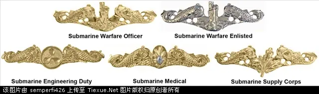 Navy Submarine Warfare Insignia - 海军潜艇资历章,由二战时期的海军作战部长欧内斯特·金海军五星上将在1923年提议的,授予在潜艇上完成某一系统(武器、机械、医疗、后勤等)的达标并可以独立合格的完成任务的海军军官或者士官,一般由艇长、总军士长(Boat/Crew Chief)以及各单位指挥官佩戴。