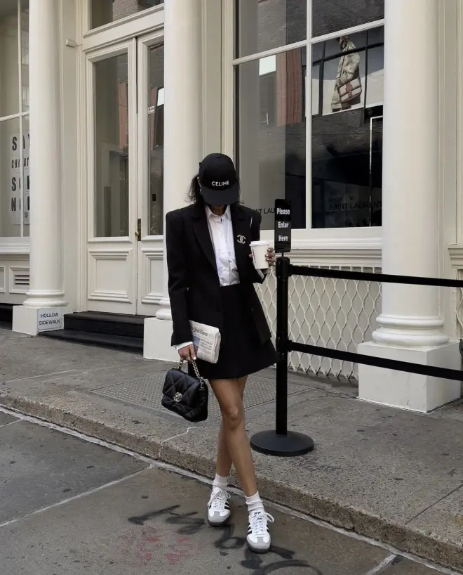 西服套装裙很通勤,内搭简约白衬衫就能穿出时尚感,不想过于职业风,鞋子就可以选择运动鞋或者板鞋,增加休闲感。