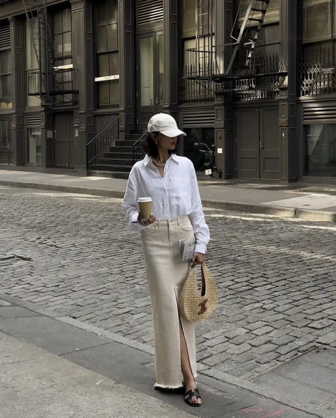 衬衫简直是法式穿搭必不可少的单品,百搭又时尚,衬衫搭配浅色牛仔长裙,休闲而松弛。