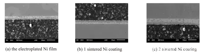 在金属化配方2的前提下,电镀镍和不同粒度镍粉烧结镍样品的表面微观形貌如图3所示。