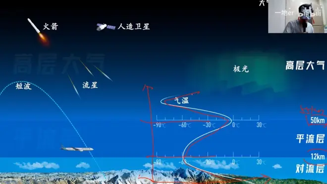 温度变化:先快速下降(远离臭氧层,失去热量)后持续上升(接收更短波长的紫外线)