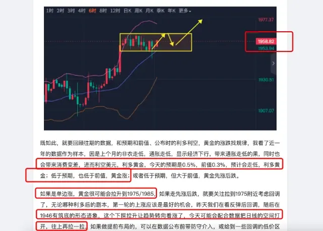 其实今天就算没数据,黄金在上周收线后,基本已经可以确定本周的连阳,所以我当时判断收在1957下方,本周要涨但先有个回调,这个回调在昨天已经走出来了,就是我们看反弹到1960回调到1947/1944,预判的非常精准,那么接下来黄金把日线布林带上轨会打开,更上一层楼了,延续上涨或回调歇歇再涨,低通胀下对黄金是很友好的。