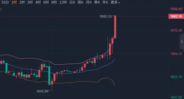 今天的数据如预测一致,低于前值低于预期,利多黄金,黄金也如预期涨到了1983,我们看的是涨到1975/1985,前目标其实在数据公布后冲高就接近了一次,随后回到数据公布前附近再次拉升到现在的1983,黄金面上涨20个点。