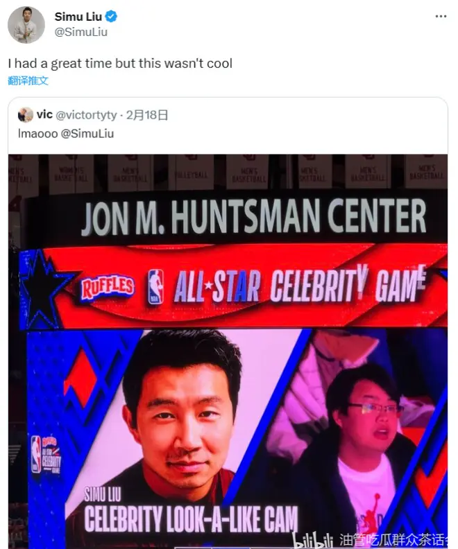 NBA比赛中场弄了个现场观众明星脸环节,拍到了一个亚洲男子看球,配上了男子长得像刘思慕。刘思慕说这个过分了吧