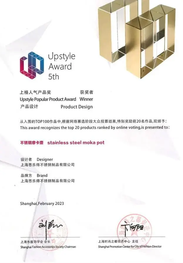 2023年2月28日,由上海时尚之都促进中心和上海市服饰学会联合主办、上格时尚文化(策划)上海有限公司承办的第五届上格时尚科创先锋榜发布。上海市轻工业协会作为本次活动的支持与合作单位,上海市轻工业协会副秘书长顾为工出席颁奖典礼,思乐得不锈钢真空保温壶“乐得壶”和不锈钢摩卡壶“乐意壶”两款产品从众多参赛作品中脱颖而出,同获“上格人气产品奖”。