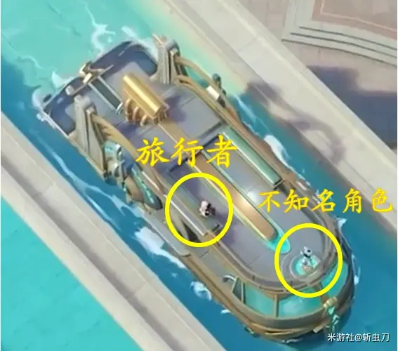 图中,旅行者正坐在一艘露天游船的顶层,某位不知名角色站在船头,或许是这艘船的船长?