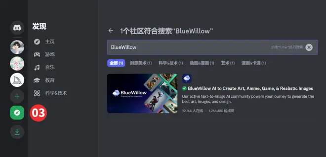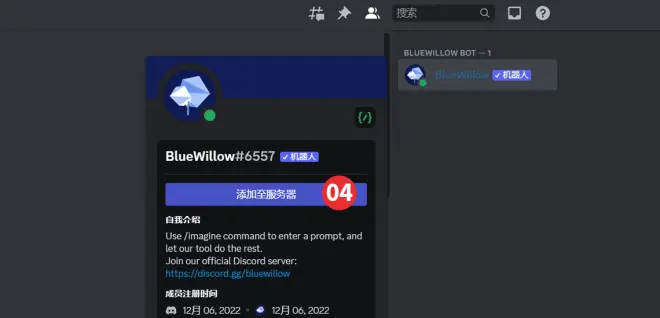 第04步:把“BlueWillow”机器人添加到自己频道。