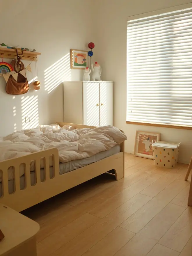 1.2米的小床两侧靠窗,四周都带有“护床半”,可以避免孩子摔小床和碰到墙面的情况发生,设计得很贴心。
