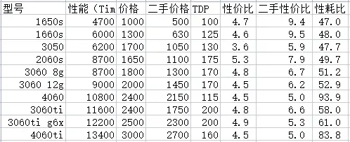 如果想买全新带质保的型号,性价比都在4.8附近,基本就是手上有多少米就选,只有3050、3060和40系产品需要注意一下性价比相对较低。在4050桌面端出来前,3050是目前最新的最低端的光追卡,可能这个让它的定价相对较高;3060 12g显存翻倍但性能只是微增,让它的定价相对偏高,炼丹可能会比较合适?40系新卡上架有一些溢价很正常,而且涨价同步全球,降价大陆特有,目前性价比相对较低。