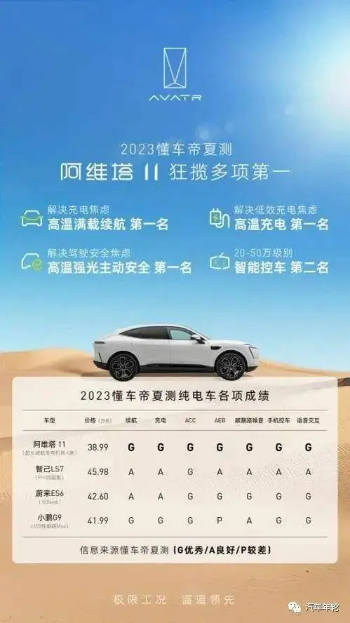 值得一提的是,在懂车帝2023年夏季测试中,阿维塔11超越一众热门车型,在高温续航、高温充电速度、高温强光下主动安全等环节斩获第一名,并在七项测试中获得“G级认证”。在补能方面拥有“天花板”级产品实力。