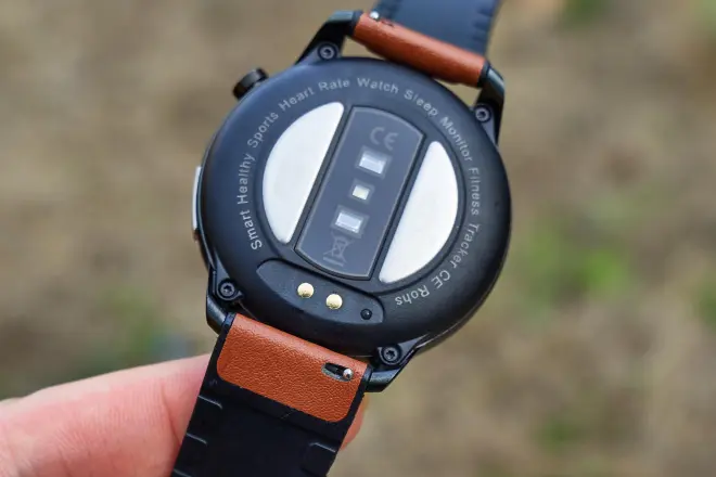 表盘背面的圆形区域也集成了红外/生物传感器和电极,磁吸充电接口也在此处。