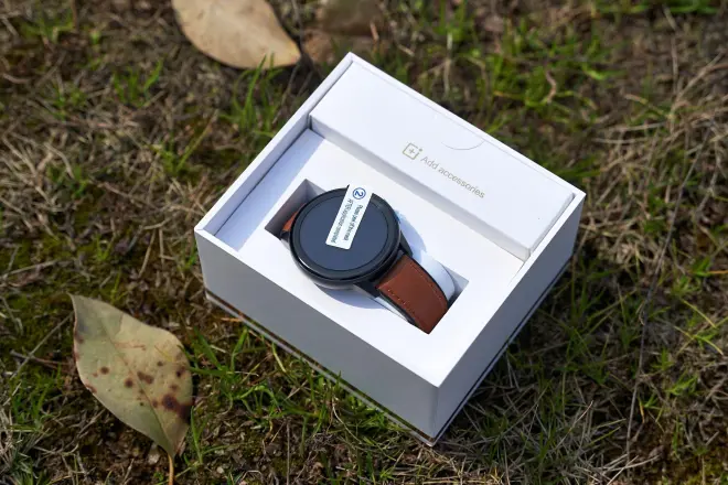 开箱可见手表已端坐其中。表盘、表耳、传感器上均贴有保护膜。