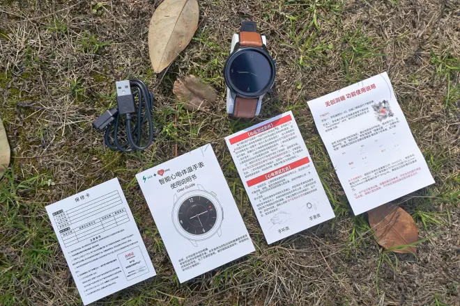 除了手表本体和磁吸充电线,还有保修卡、说明书。dido对于心电和血糖功能相当重视,专门配上了功能使用教学卡片,帮助老年用户规范操作获得精准数据。