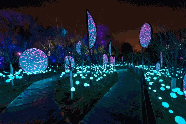 “氛围感”的营造可以用多种科技手段实现,呈现方式包括AR互动触感装置,裸眼3D投影秀,体感发光装置,全息水幕......通过对场地的研究,将更多丰富多彩的体验内容与互动感受相结合,因地制宜地打造多维的沉浸式夜游模式。