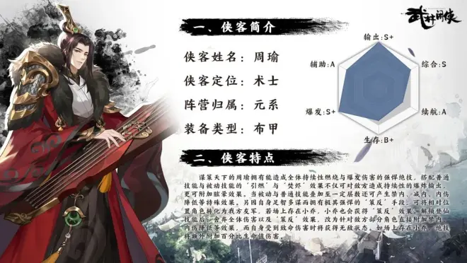 战斗开始时,若周瑜位置相对的敌人为敌方攻击力最高的侠客,则会为敌方攻击力最高的侠客施加“策反”状态5秒,被策反的侠客会转而攻击自己的友军,但无法使用必杀技,策反成功后,周瑜会获得一定的攻击力和攻速提升,若周瑜位置相对的敌人不是敌方攻击力最高的侠客,则周瑜会对位置相对的敌人造成一定攻击力的伤害,并使其眩晕3秒,若场上存在小乔,则小乔位置相对的是敌方攻击力最高的侠客也可触发策反。策反失败也将获得攻击力与攻速提升。搭配小乔稳定触发两个开场策反效果,拥有一定的容错率可在面对难以战胜的对手时逆转结局。