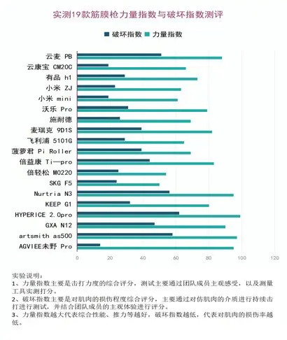 下图是19款筋膜枪在力量与破坏力两方面的数据分析图,大家可以对比一下各大品牌的击打力度与对肌肉的损伤程度,结合自己的肌肉承受能力,在选购前先有一个大概的了解: