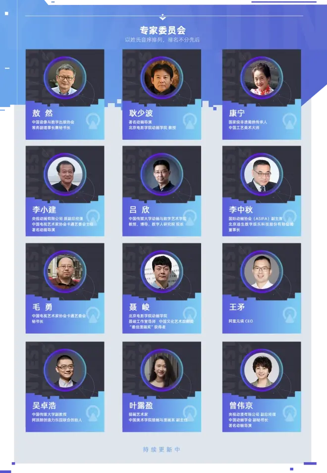 此次大赛,邀请到了各行业重量级的人士担任评委,如中国音像与数字出版协会常务副理事长兼秘书长敖然、《中国奇谭》总导演陈廖宇、国家级非遗传承人康宁、北京电影学院动画学院院长李剑平、国际动画协会副主席李中秋、央视动漫有限公司副总经理曾伟京、阿里元境CEO王矛等。