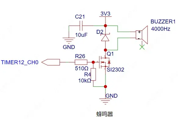 如果没有这个续流二极管,停止给蜂鸣器供电的时候,在蜂鸣器两端会有反向感应电动势,产生高达几十伏的尖峰电压,会损坏驱动电路。
