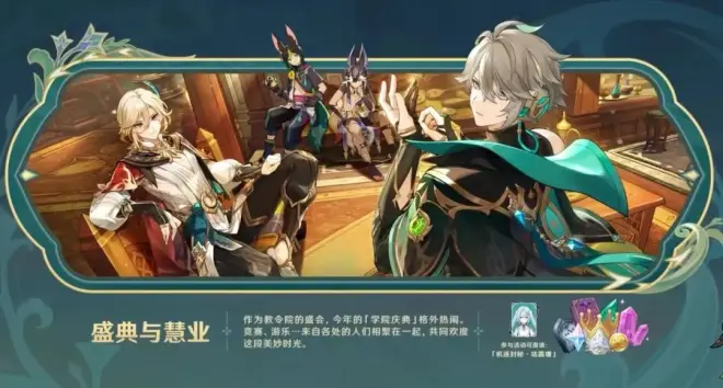 3.6版本的主题活动为“盛典与慧业”,这个主题活动会和许多须弥角色打交道,会有6个不同学院的小游戏。此外除了主题活动外,还有4个小活动分别风沙轰鸣、合剂演进、忆昔诸途巡历、精通移涌这些。