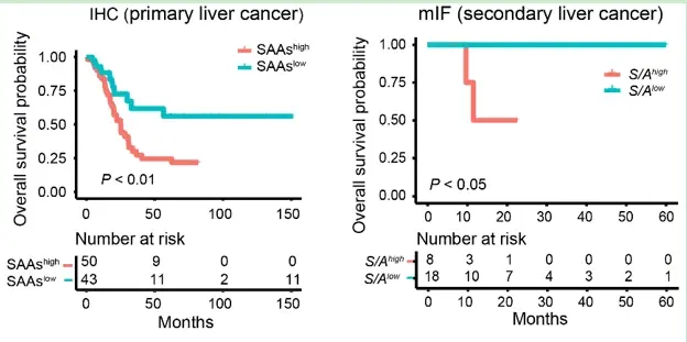 在发现了受损伤的正常肝细胞会产生SAAs高表达,并产生一些列的“蝴蝶效应”,最终能促进肿瘤的进展后,研究人员做了进一步的探究,发现侵袭前沿区富集的损伤状态肝细胞与原发肝癌的不良预后显著相关,类似发现在转移性肝癌中也得到了证实。