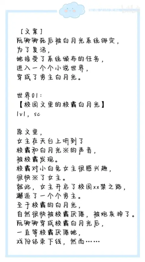 清纯白月光是那么的格格不入,她深受男主喜爱,是男主不敢碰触的存在。