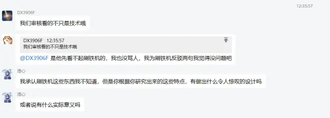 首先是在我审核完成等待通知后,DichuuCraft服务器审核群内某成员问我:“进服想做什么”,我回答:“刷铁机”,这时候另一位管理说:“效率靠硬堆的刷铁机?那属实没必要”,当时,我个人认为他这句话充满了对我刷铁机领域的认知表示不屑,尤其是“硬堆”这个词,我这人就是非常小心眼,已经开始有点火气了,我后面问的问题,他也没有正面回答,之后虽然我有点火气,但也没开始破口大骂,就想要个道歉,结果他开始撕破脸了,说:“说句不好听的,1.14以后的刷铁机根本就是有手就能造”,这时候我觉得这个服务器也没必要进了。