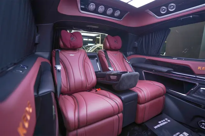 克蒂圣母峰MH7整车高端定制,波尔多红内饰,搭配着BV真皮,呈现出的高雅、奢华、稳重的质感。还有水晶石英灯,进口羊绒地、BV真皮,内饰非常有档次。而且整车经过三层隔音降噪处理,坐在零重力航空座椅上,非常放松。