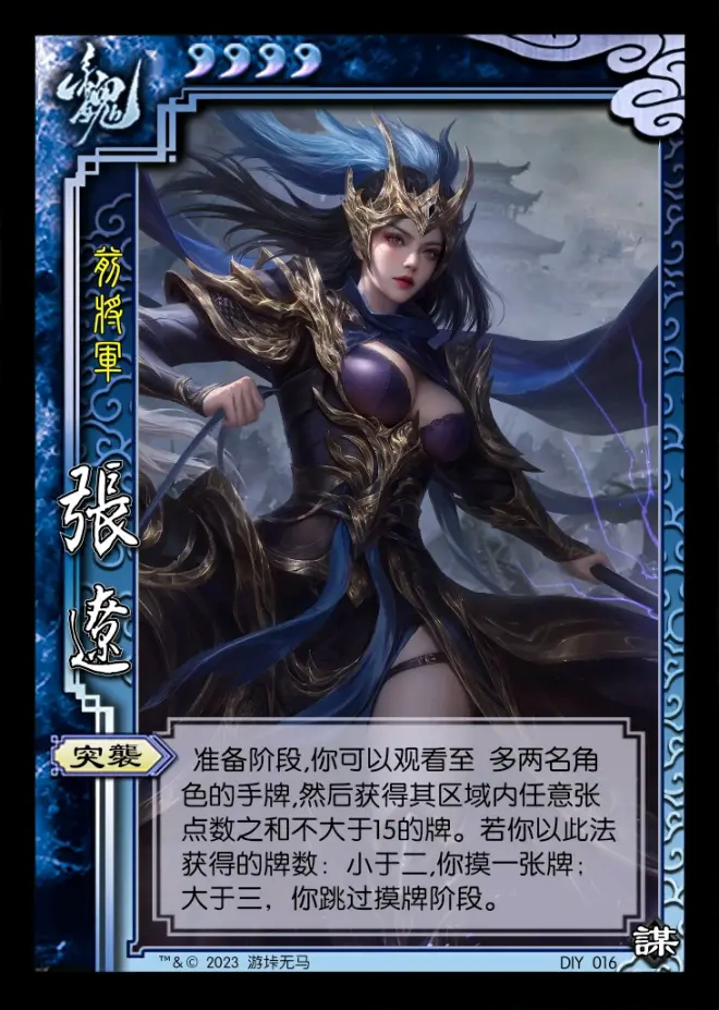 第一张:谋张辽。设计者:游垰无马 说实话,看了这么多谋张辽,第一次见到如此简洁的谋张辽,我还是大为吃惊。这个突袭的话,最高理论上可以达到三张以上。但是呢这个突袭不是稳定的。因为你首先毕竟对面点数不大于15,那么这个还是很难的,平均点数就5,是很少见的,那么绝大部分可能情况下就是最多顺二,甚至是顺一了,但然我们毕竟要考虑是两个角色,然后是任意选择,可能还是可以顺3。但是这个武将的最高理论也是顺5,和前面的谋张辽比起来,这个实在是比较差的,可能放到群英荟萃里送的,但还是比较弱,可能放到界更合适些。