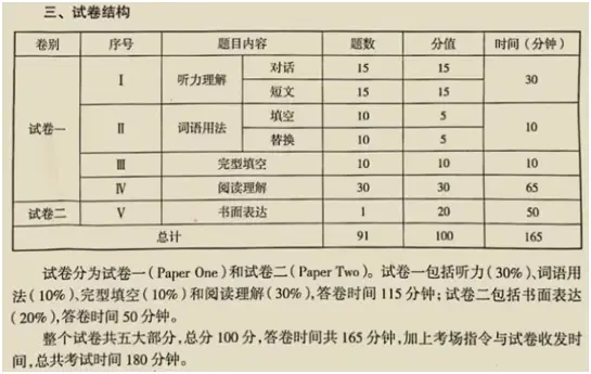 今年试题题型、题数、分值和新大纲一致,书面表达是汉译英。附新大纲的题型,分值和做题时间。