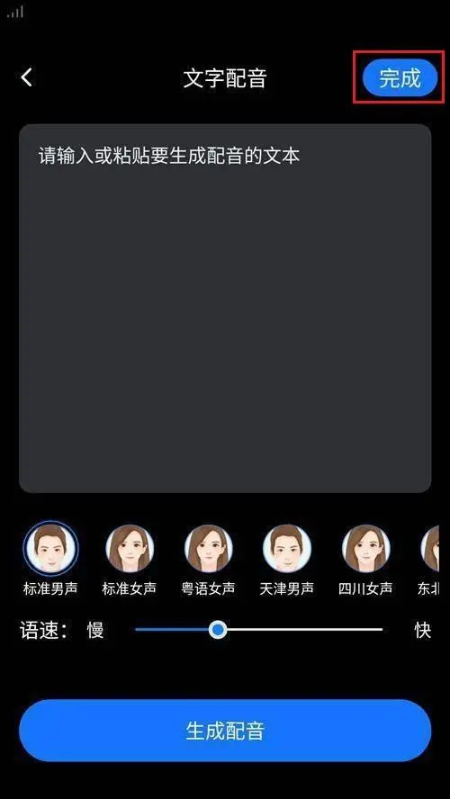 第四步:进入文字配音,首先输入配音内容,然后在下面选择配音声音。有多种声音可供选择,包括男声、女声和一些方言音。调整下面的滑块来调整语速。设置完成后,点击生成配音,最后点击右上角的完成,生成视频。