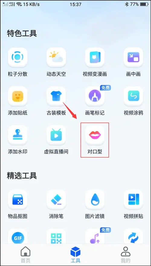 第一步:首先打开手机上的【书单视频助手】工具,在首页点击发现。发现页面中有许多工具。在特色工具下找到【对口型】功能,点击【对口型】。