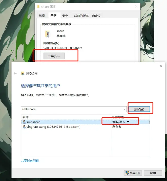 4、任意位置----新建文件夹----属性----共享 进行如下设置