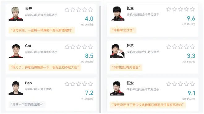 而反观AG超玩会这边,他们还是因为磨合程度不太够,所以未能将这一套首发阵容的实力全部发挥出来。第1小局比赛都那么大优势了,而且还是黄忠体系,按理说是不应该输的。如果AG超玩会是2比0WB率先拿到3个赛点,那情况就完全不一样了。而且钟意、极光这两个点,真心发挥不是特别好。尤其是钟意这个点,感觉他虽然是133段打野,但可能因为磨合时间过长,还是未能很好地融入队伍,所以打得有点儿奇怪,而且有时候还因为赛场经验不足,有一点儿急躁的情绪出现。鉴于钟意、极光两人这一战的表现都不是特别好,所以他们的赛后评分也都不高,分别是3.3、4.0。