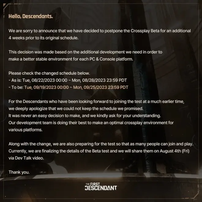 游戏官方就延期问题向广大玩家发文致歉:“我们真诚地道歉,延期是很难的决定,但为了致力于所有平台打造更好的优化测试环境,仍需一定时间。”